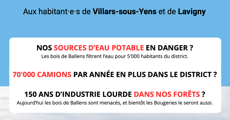 L’Association pour la Sauvegarde des Bois de Ballens et Environs continue à informer les villages impactés par le projet de mégagravière de Ballens. Après Aubonne, Montricher, Apples et d’autres villages, c’est cette fois à Villars-sous-Yens que l’ASBBE fait étape, pour les habitants de ce dernier village et ceux de Lavigny plus particulièrement, mais chacun·e est … Lire plus
